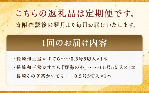 - ■1回あたりのお届け内容 ・長崎和三盆かすてら0.5号(5切入)×1本 ・長崎和三盆かすてら「琴海の心」0.5号(5切入)×1本 ・長崎そのぎ茶かすてら0.5号(5切入)×1本 ※寄附確認後の翌月より毎月(計3回)お届けいたします。