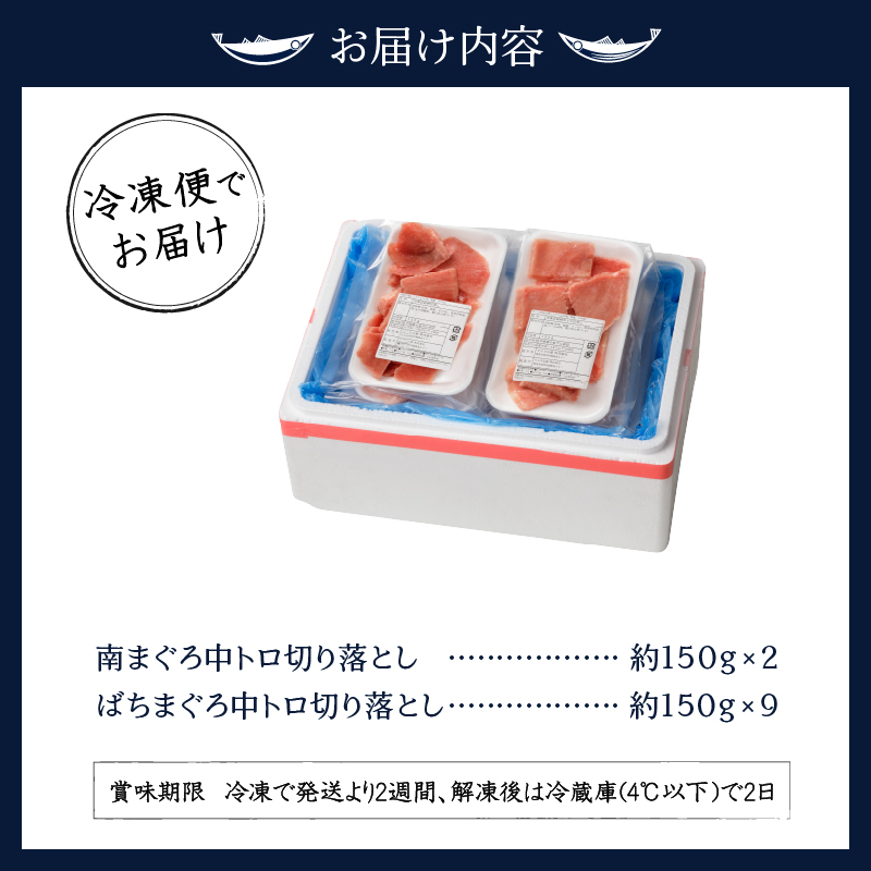 南まぐろ中トロ切り落とし:約150g×2、ばちまぐろ中トロ切り落とし:約150g×9