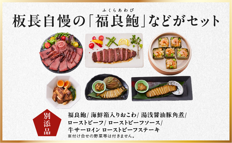 福良鮑 2個、海鮮箱入りおこわ 6個、湯浅醤油豚角煮 200g、ローストビーフ 100g、ローストビーフソース 1個、牛サーロイン ローストビーフステーキ 1枚