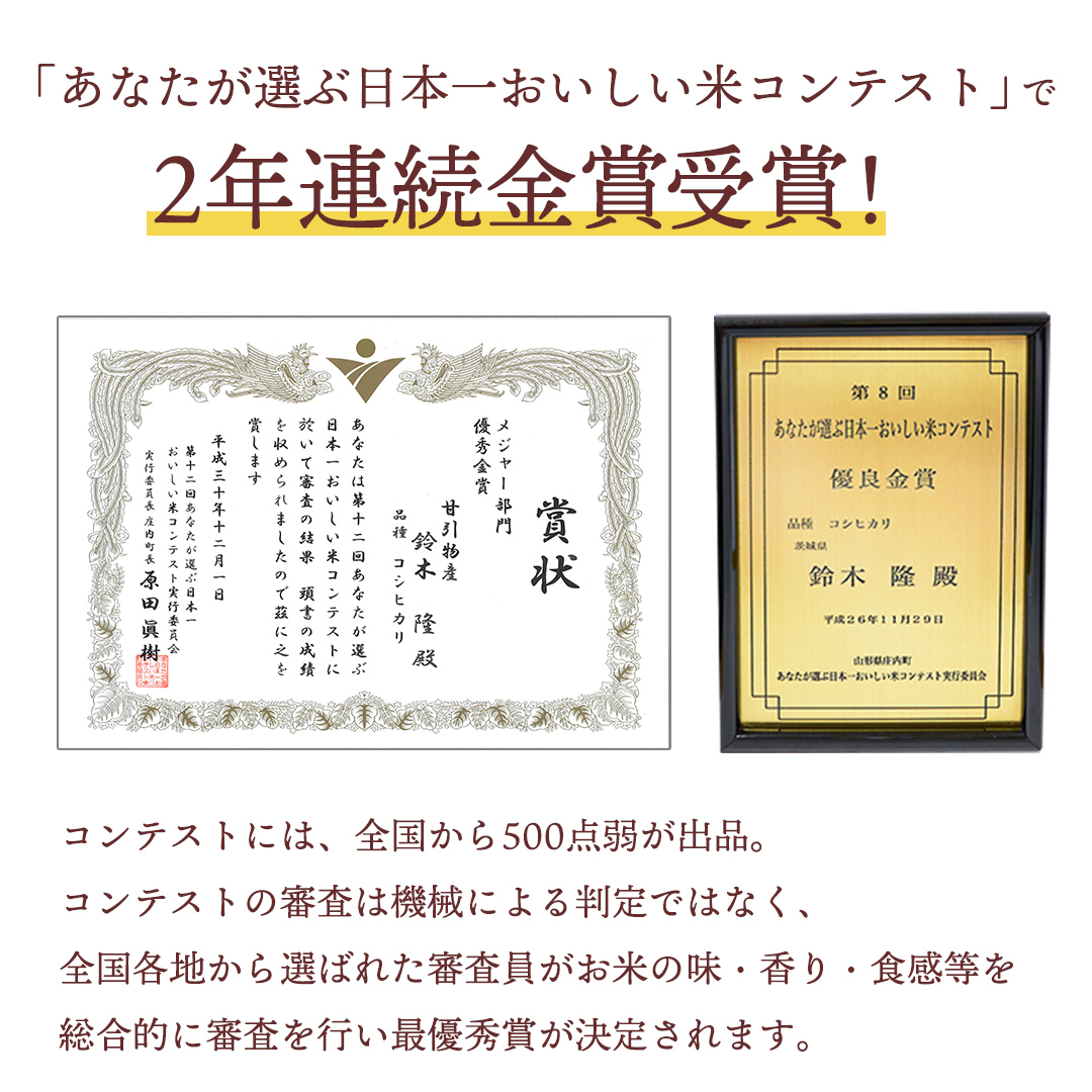 全国各地から選ばれた審査員がお米の味・香り・食感等を総合的に審査をして選出、予選審査で30点まで絞られ決勝大会で再び審査を行い最優秀賞が決定されます。