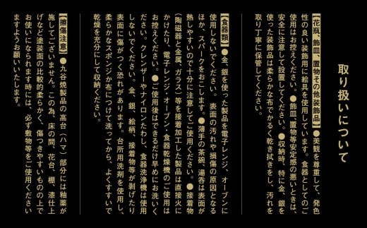 ◎九谷焼製品の高台(ハマ)部分には釉薬が施してございません。この為、床の間、花台、棚、漆仕上げなど塗装面の比較的柔らかく、傷つきやすいものの上でお使いになられます時には、必ず敷物等をご使用くださいますようお願いいたします。
