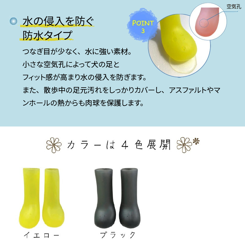 熱くなったアスファルトやマンホールから足を保護し、滑りやすいフローリングでの滑り止めになります。足先や肉球の保護はもちろん、雨や雪の日のお散歩などの汚れ防止や防災用としてもご使用できます。