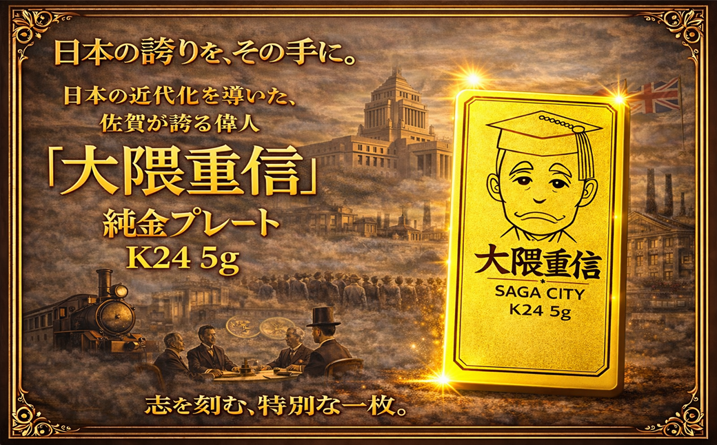 本品は、大隈重信の肖像と志を刻んだ純金K24の寄附記念プレート。