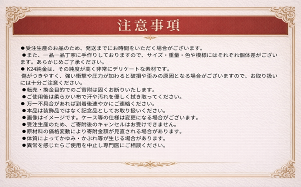 ※K24純金は、その純度の高さゆえに非常にデリケートな素材です。強い衝撃や圧力が加わると破損や歪みの原因となる場合がございますので、お取り扱いには十分ご注意ください。