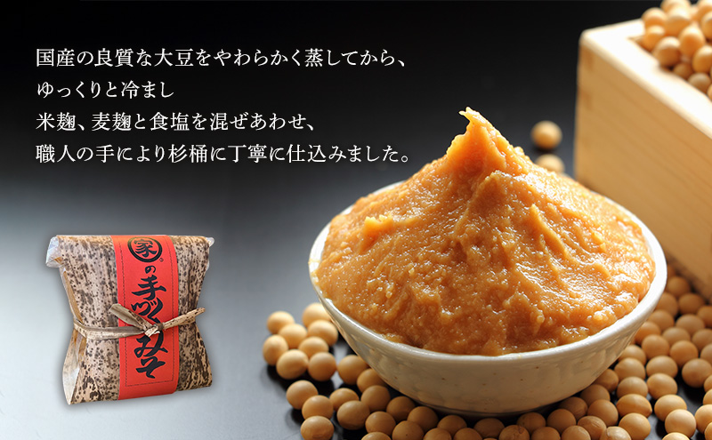 米麹、麦麹と食塩を混ぜあわせ、職人の手により杉桶に丁寧に仕込みます。