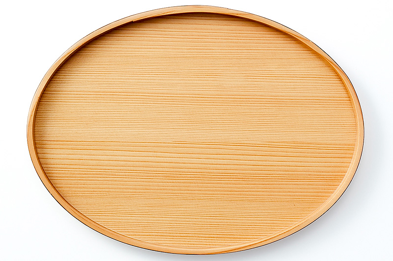 「Round AKITA」(秋田一周)という名のように、トレイの周囲をぐるりと桜皮の帯であしらい、杉との美しいコントラストを構成しています。
