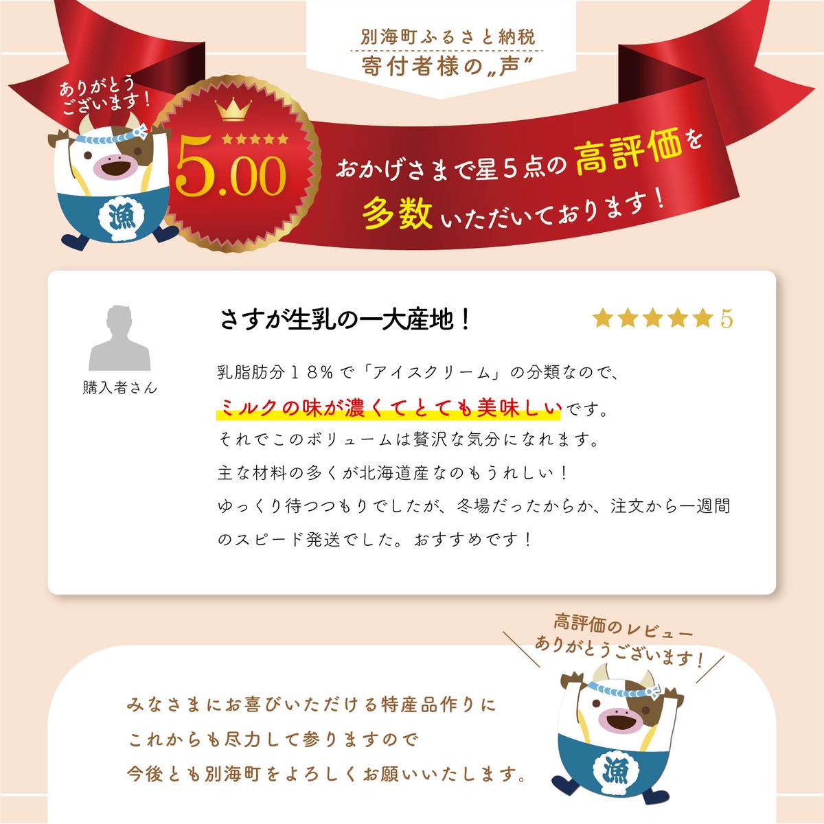 同じアイスクリームでも、多いのは乳脂肪分が8.0%。10%を超えるものは少ない中、このアイスクリームの乳脂肪成分は18%!乳脂肪率が高いほど濃厚でコクのある味わいとされています。ぜひ北海道産生乳の風味を存分にお楽しみください。