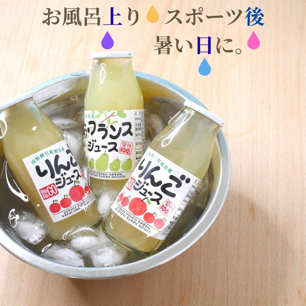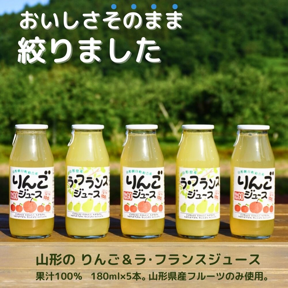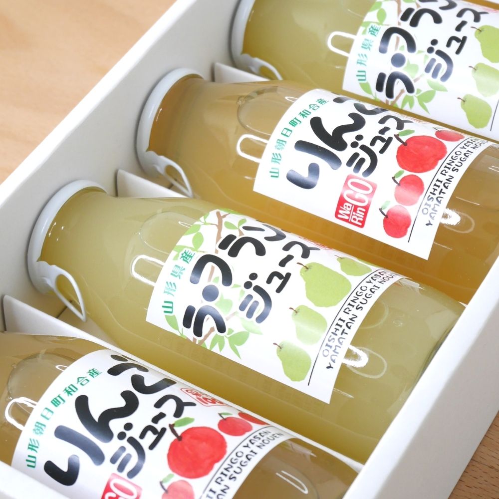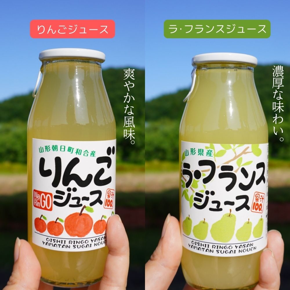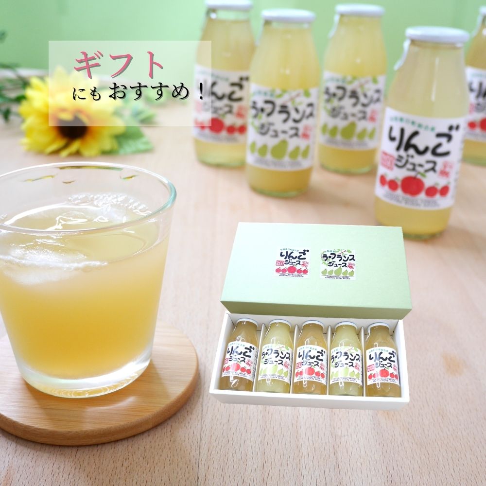 風味の爽やかなりんごジュース3本と、とろりとした舌触りとラ・フランスの香りが漂う濃厚な味わいのラ・フランスジュース2本の2つの味が楽しめます。