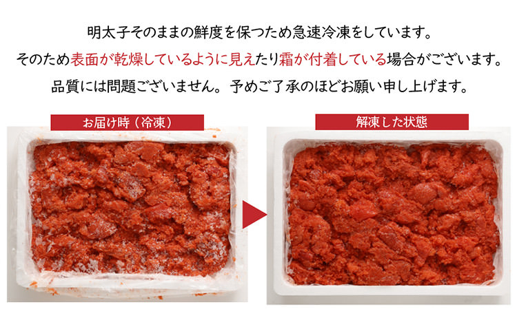 今回ふるさと納税用でご用意させて頂いた商品は1本物を製造する際に出る切子という明太子で、味付け、製造工程は変わらず味わいはまったく変わらない商品です。