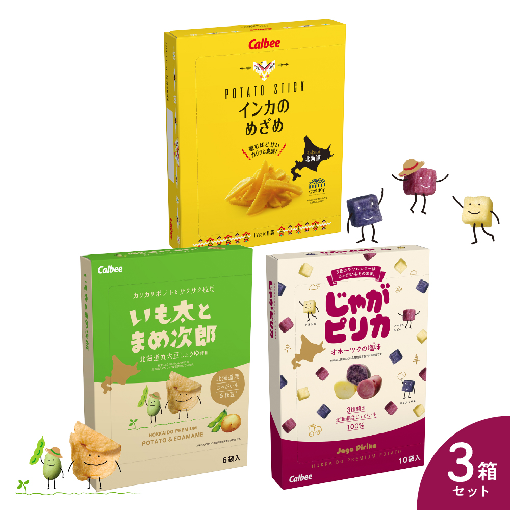 いも太とまめ次郎(14g×6袋)・じゃがピリカ(18g×10袋)・インカのめざめ(17g×8袋) 各1箱