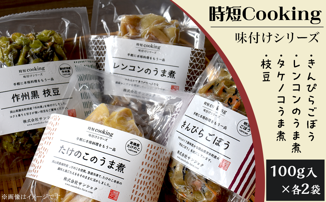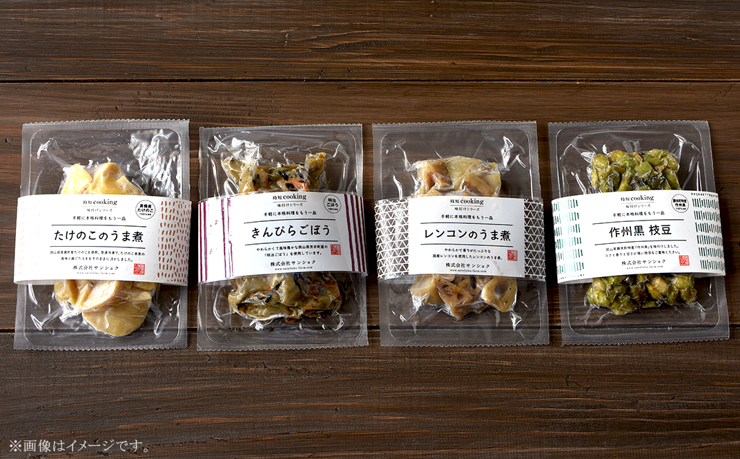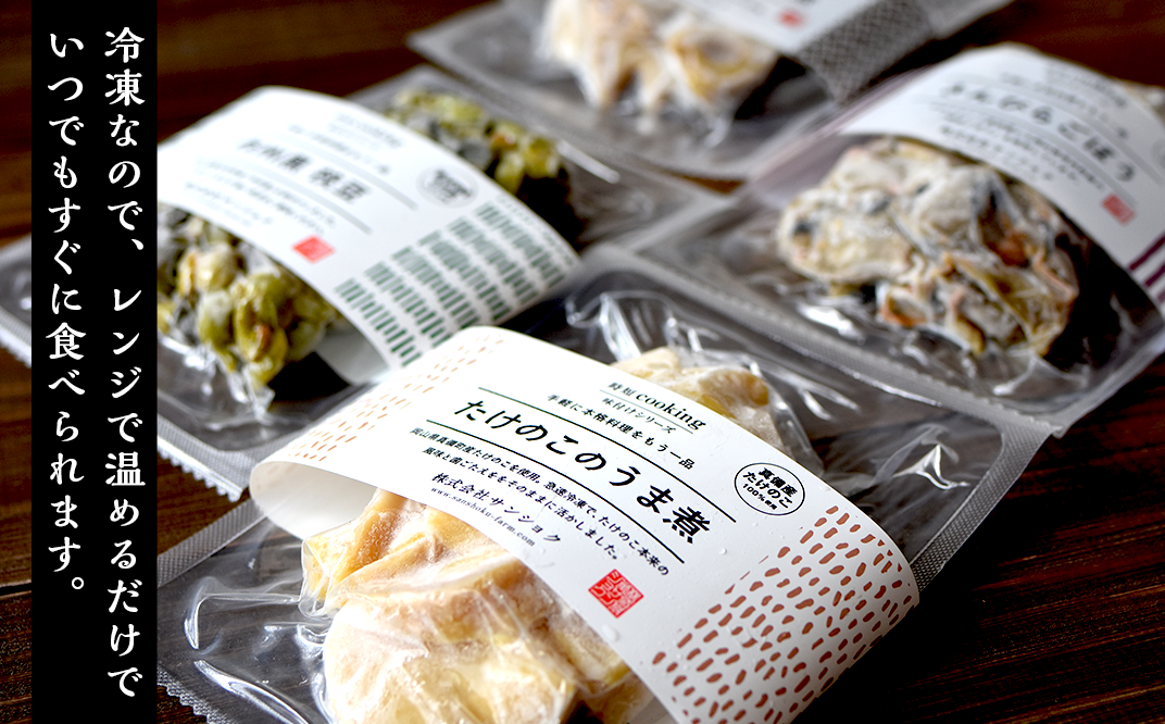 真備産のタケノコをボイルし、急速冷凍したものを味付けしました。生の食感が生きています。