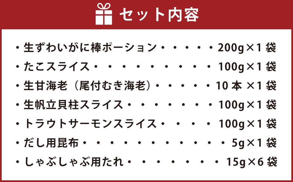 蟹をはじめとする新鮮な海の幸をむき身・スライス加工し、しゃぶしゃぶ用に取り揃えました。「しゃぶしゃぶ料理」ならではの旨味と食感を存分にお楽しみください。