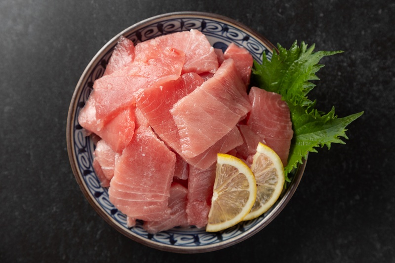 【原材料】目鉢鮪中とろ切り落とし:鉢鮪、 食用植物油脂、PH調整剤、酸化防止剤(V.C)