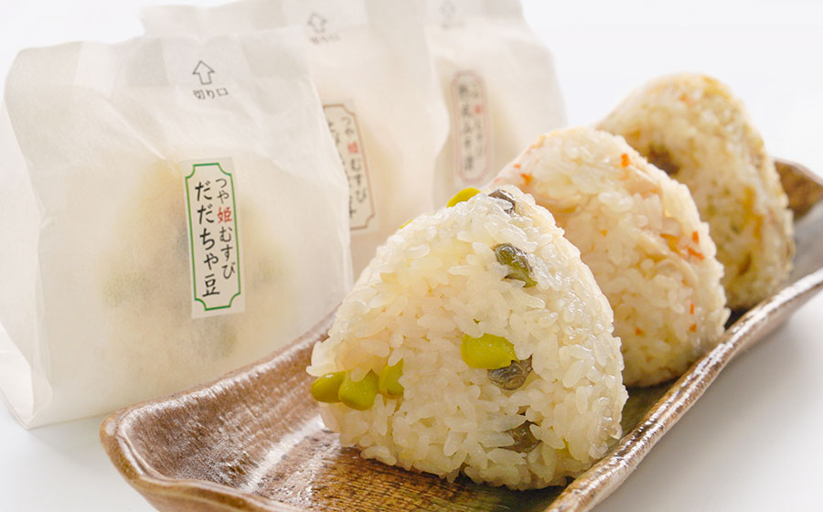 『つや姫むすびだだちゃ豆』甘みと香りが絶品の枝豆の王様「だだちゃ豆」を贅沢に使った香り高い炊き込みごはんのおむすび。