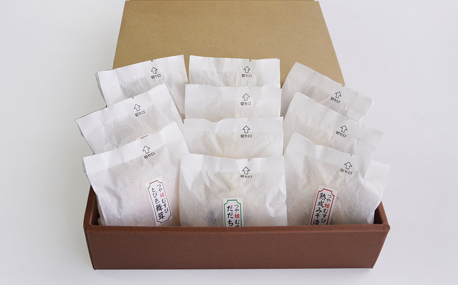 『つや姫むすびとび色舞茸』山形県産のとび色舞茸の炊き込みごはんのおむすび。