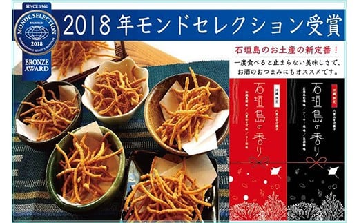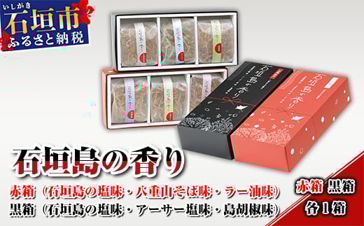 赤箱・黒箱各1箱(1箱につき3種類の小袋入り)/赤箱(石垣島の塩味・八重山そば味・ラー油味)、黒箱(石垣島の塩味・アーサー塩味・島胡椒味)