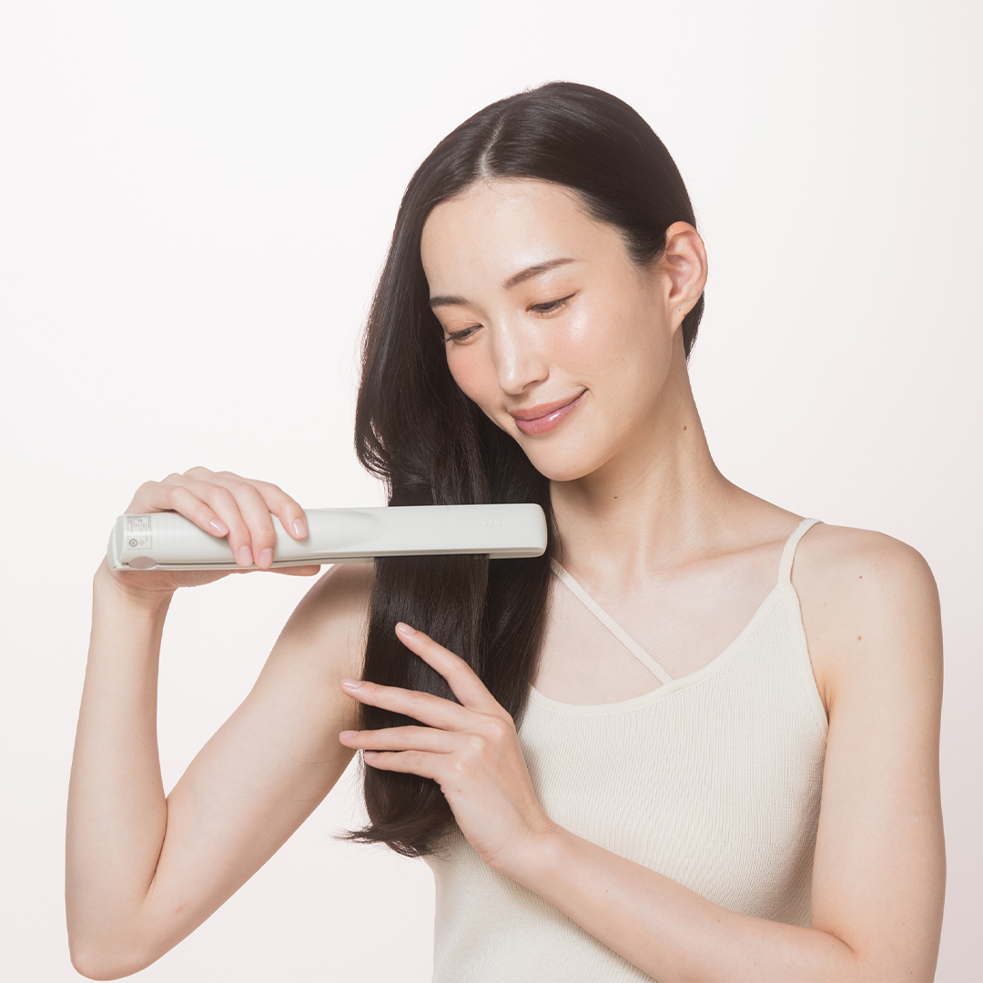 2.本体の電源をONにし、毛束を一ひとつまみ(約3cm幅が目安)とり、ソニックプレートの中央で挟み、毛先へ向かって、本体をまっすぐ滑らせます。
