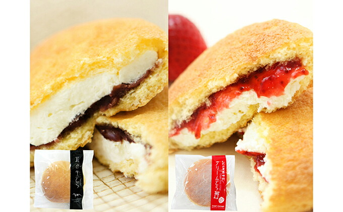 つぶ餡と生クリームをサンドした「北の生どら」と、苺ジャムと生クリームをサンドした「クリームどら苺」の洋風生どら焼きペアセットです。セット内容:12個入り(各6個入り)