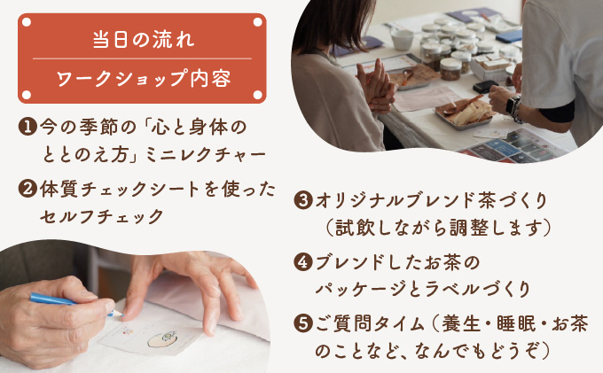「自分の体調や体質にあったお茶を、自分の手でブレンドしてみたい」。そんな方のために、オリジナルブレンド茶づくりのワークショップです。