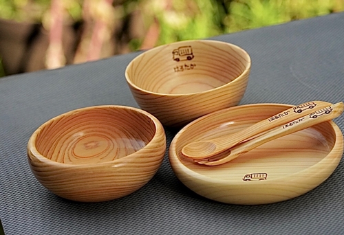 ボウル直径約10.5cm高さ約5cm ×1個 ボウル直径約11.5cm高さ約4.5cm ×1個 プレート約14cm高さ約2cm ×1個 スプーンとフォーク約13cm ×各1個
