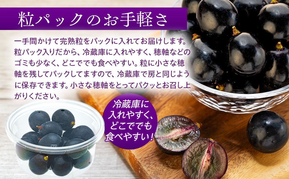 一手間かけて完熟粒をパックに入れてお届けします。粒パック入りだから、冷蔵庫に入れやすく、どこででも食べやすい。粒に小さな穂軸を残してパックしますので、冷蔵庫で房と同じように日持ちします。小さな穂軸をとってパクッとお召し上がりください。