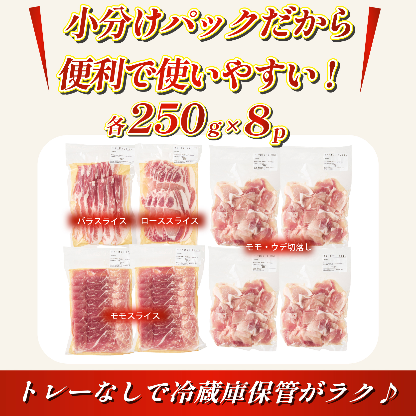 豚ローススライス250g×1P、豚バラスライス250g×1P、豚モモスライス250g×2P、豚モモ・ウデ切落し250g×4P