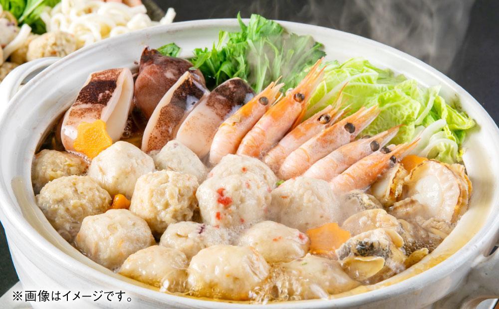 「えび」や「いか」等の魚介を詰め合わせました。「4種のつみれ」と「各具材」の旨味が鍋いっぱいに広がります。