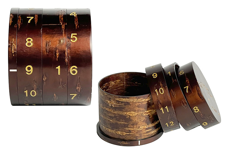 秋田大学の学生と(有)冨岡商店が共同で創作した樺細工の万年カレンダーは、「何世代にもわたる家族の絆」と「エシカルな意識の共創」をテーマに、樺細工が持つ質感と色合いを現代に調和させ、茶筒の構造を利用して、日付をあわせるというユニークな特徴を持った世界に唯一のデザインとして生み出されました。