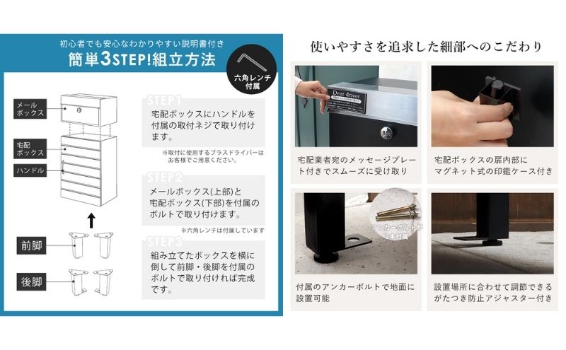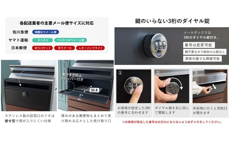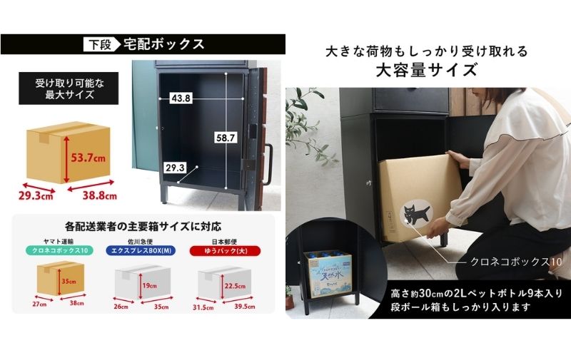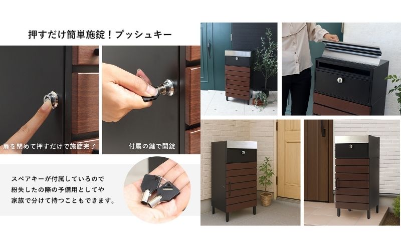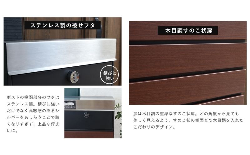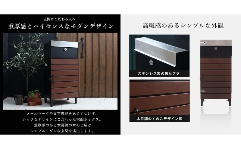 ブラックのボディに木目柄ドアを合わせたモダンでおしゃれな宅配ボックスポストです。一戸建て用・自宅用の一体型 置き型ポストで、大容量の収納が可能です。