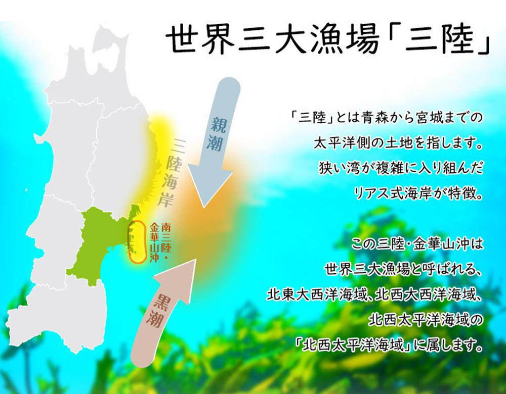 石巻市(いしのまきし)は宮城県北東部、北上川の河口に位置し、世界三大漁場の一つに数えられる三陸・金華山沖を有する海のまちです。親潮と黒潮がぶつかる潮目であることに加え、リアス式海岸や点在する島々のおかげで多様な魚が集まる地形となっており、また世界有数の植物プランクトンの発生地でもあることから、かき、ほや、帆立などが美味しく育ちます。