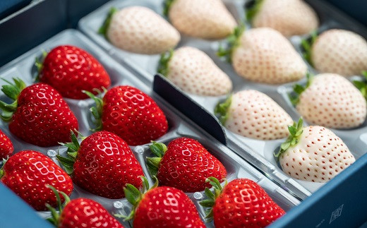 一般的な赤いいちごに比べて酸味が少なくほのかに香る甘い匂い、甘く上品な後味、果肉も白く粒だけが赤いのも特徴でとても珍しい白いちご「パールホワイト」。