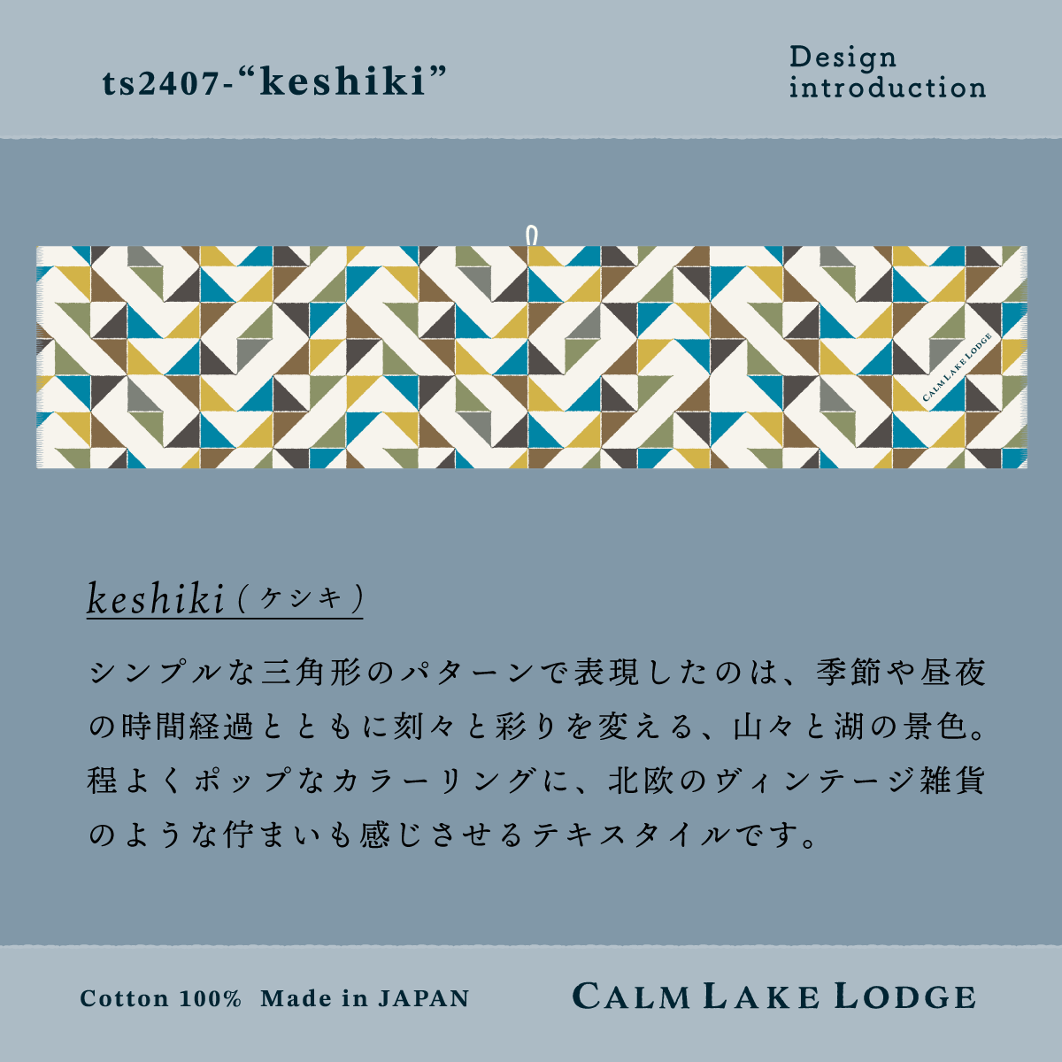 シンプルな三角形のパターンで表現したのは、季節や昼夜の時間経過とともに刻々と彩りを変える、山々と湖の景色。