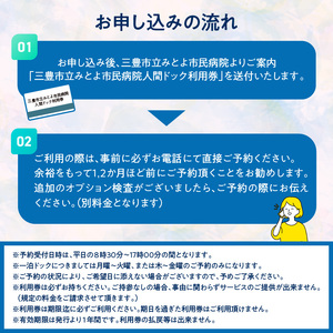 1.お申し込み後、三豊市立みとよ市民病院よりご案内「三豊市立みとよ市民病院人間ドック利用券」を送付いたします。