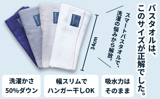 通常のバスタオルの長さはそのままに、幅をスリムにした「スマートバスタオル」を同梱。吸水力は十分ながら、洗濯物がかさばらず、ハンガー干しも可能な現代のライフスタイルに最適なサイズです。