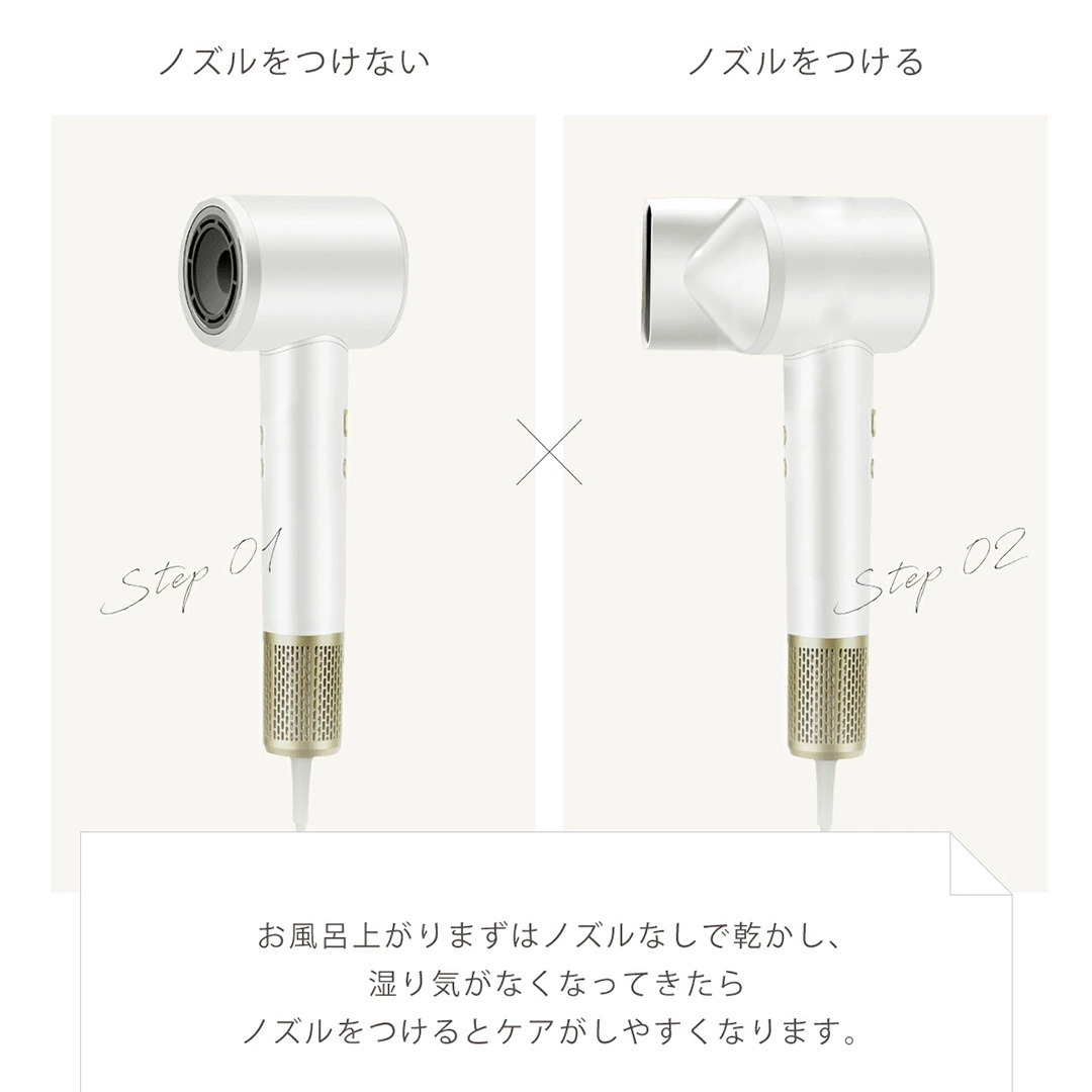 ヘアドライヤーの吹出口に搭載した1立法cmあたり約2億個の高濃度マイナスイオンが髪の潤いを守り、静電気を抑えることで、毛芯に水分を浸透させて潤いを与えます。