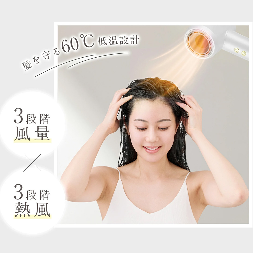 高温、強風の設定で温風温度は最高約94度。同じ消費電力のドライヤーにくらべて低温で髪の熱によるダメージを防ぎます。