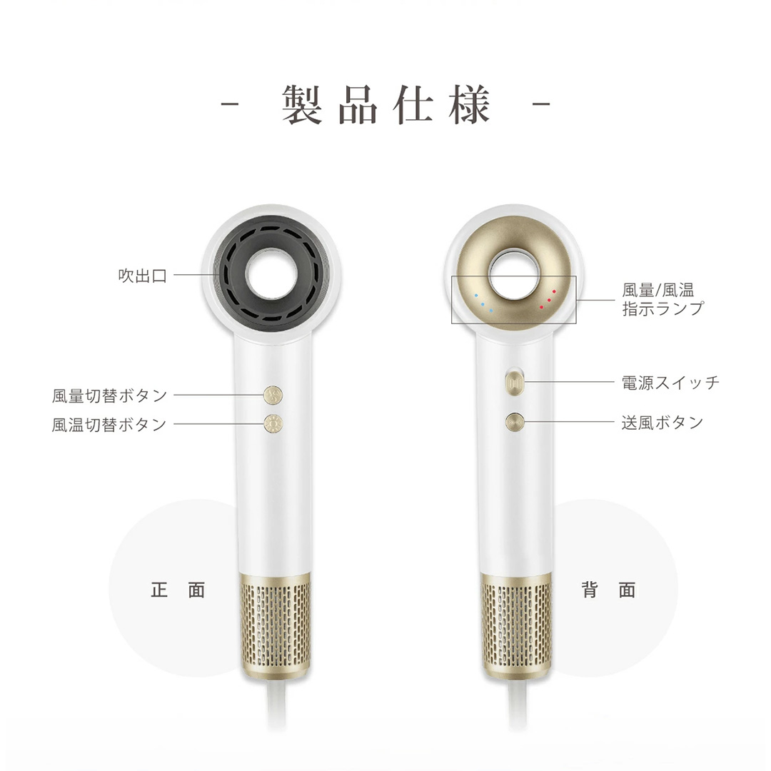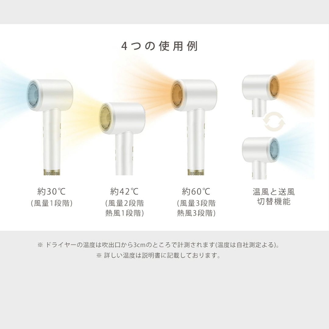 ドライヤーには、送風、低温、中温、高温などの4つの風温調節と、弱風、中風、強風の3段階の風量調節モードでお好みの設定が可能です。