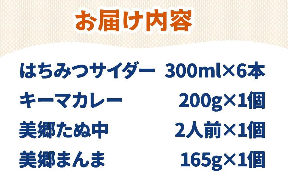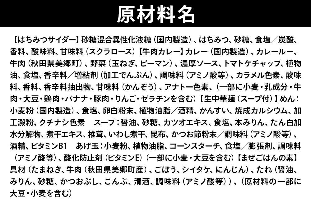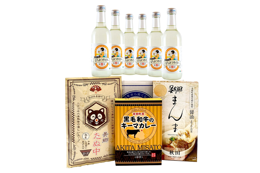 秋田県美郷町の豊かな水源と良質な水質の水を使用したはちみつサイダーと、美郷ご当地グルメ「美郷たぬ中」と「美郷黒毛和牛のキーマカレー」と「美郷まんま」をセットにしてみました。