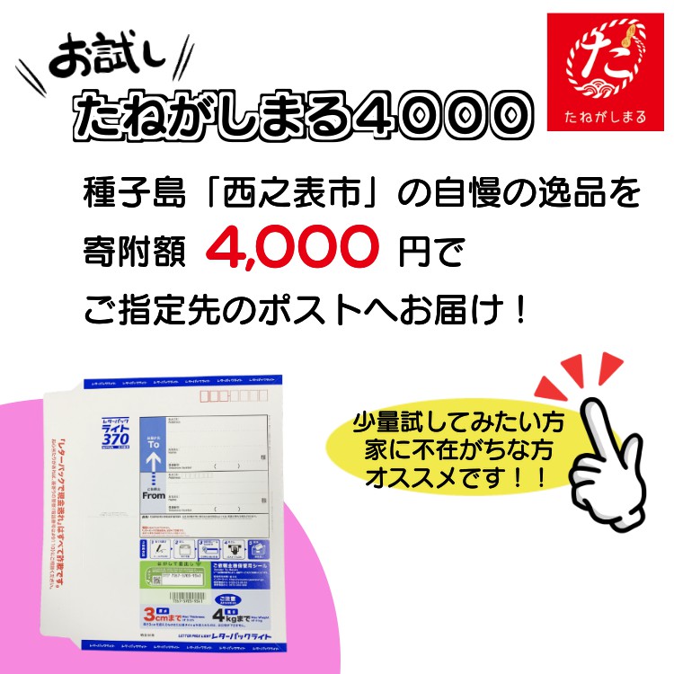 ・種子島「西之表市」の自慢の逸品を寄付金額【4,000円】で、ご指定先のポストに、お届いたします!