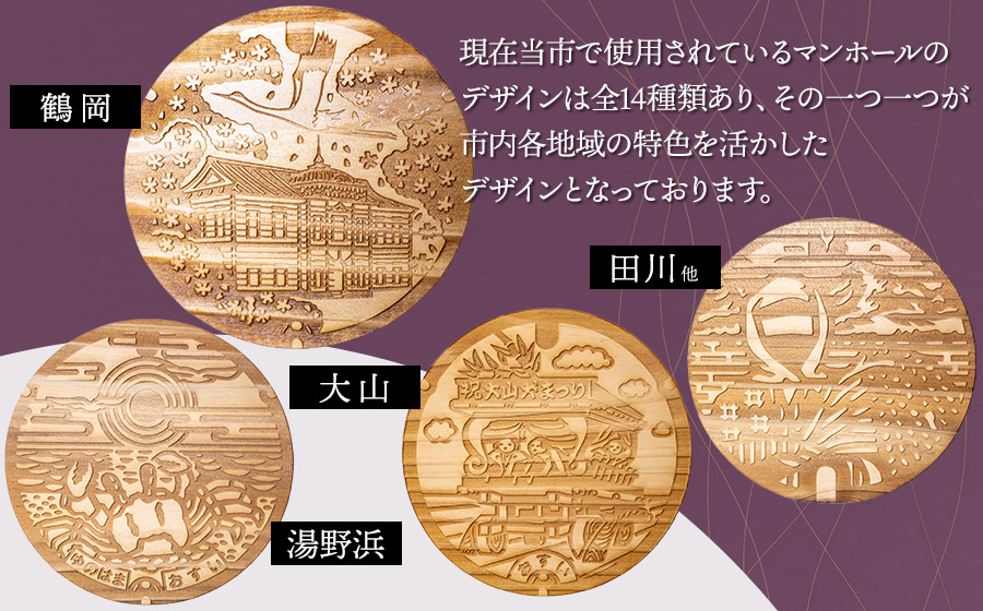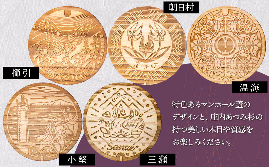 特色あるマンホールふたのデザインと、庄内あつみ杉の持つ美しい木目や質感をお楽しみください。