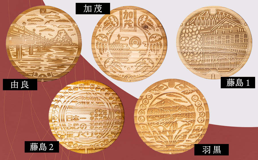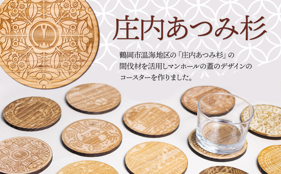 鶴岡市温海地区の「庄内あつみ杉」の間伐材を活用し、マンホールふたデザインのコースターを作りました。