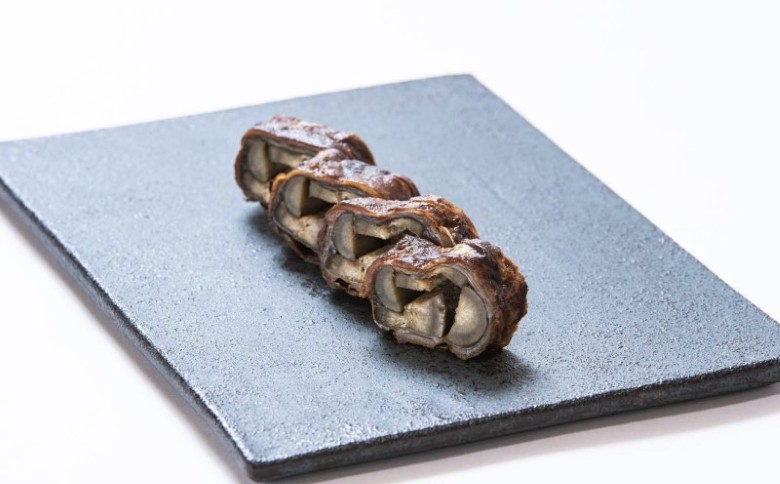 「ごぼう巻き」…厳選した新鮮なエソの皮を代々當主が受け継いできた秘伝のタレにつけ込み、ごぼうを芯に巻き、香ばしく1本1本丁寧に焼き上げた萩特産の逸品です。