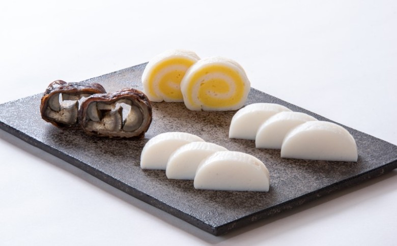 「忠小兵衛」…山口近海でとれた新鮮なエソを原料とした元祖焼き抜き蒲鉾です。蒲鉾に凝縮された魚の旨味や独特の歯ごたえをお楽しみ頂くために、まずは何も付けづず、そのままお召し上がりください。
