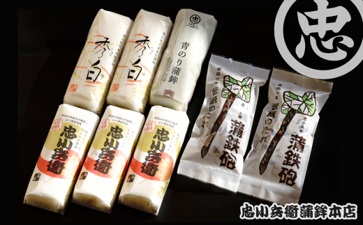 忠小兵衛(130g)×3、秀白(130g)×2、ごぼう巻き(1本入)×2、青のりかまぼこ(130g)×1