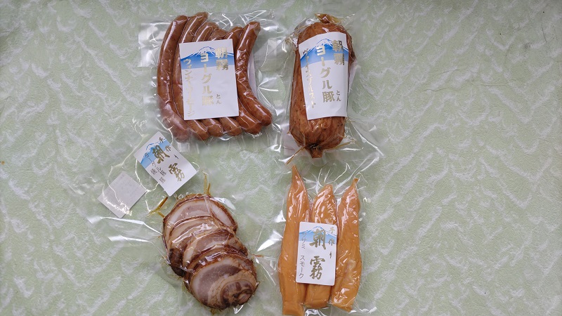 ブランド豚 朝霧ヨーグル豚を使用した「ウインナーソーセージ」と、「焼豚」、スパイスと黒胡椒を加えた太いソーセージ「ヴァイスブルスト」に、国産のササミを一本ずつスモークした「ササミスモーク」の4品です。
