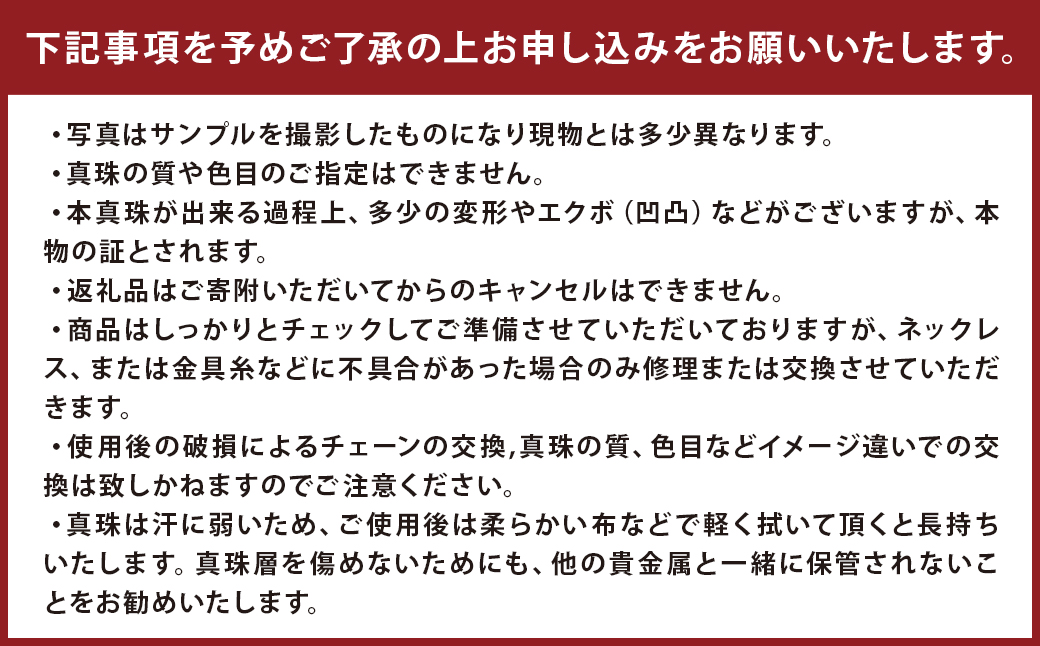 ・使用後の破損によるチェーンの交換,真珠の質、色目などイメージ違いでの交換は致しかねますのでご注意ください。