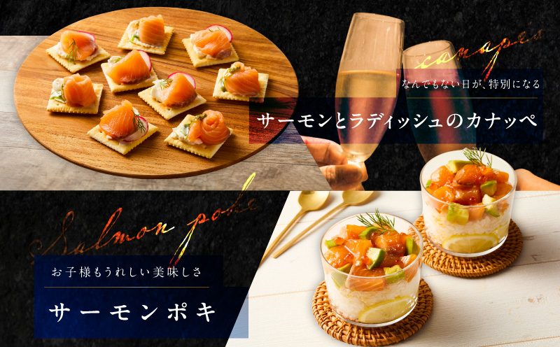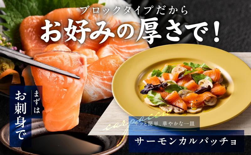 ブロックタイプですので、贅沢に厚切りにしてお刺身で、薄切りにしてカルパッチョ、ダイス状にカットしてサーモン丼など、お好みの厚み・形でお楽しみいただけます。