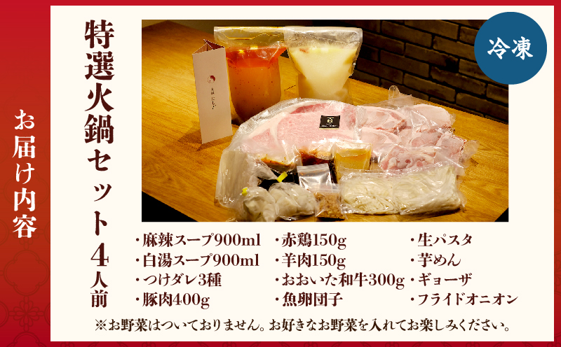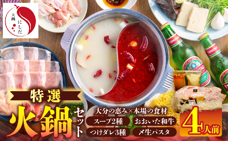 スープ2種、つけダレ3種、お肉3種(豚肉、羊ラム肉、赤鶏肉)に加え、大分のプレミアム牛肉、「おおいた和牛」が贅沢に300g入った特選火鍋セットです。