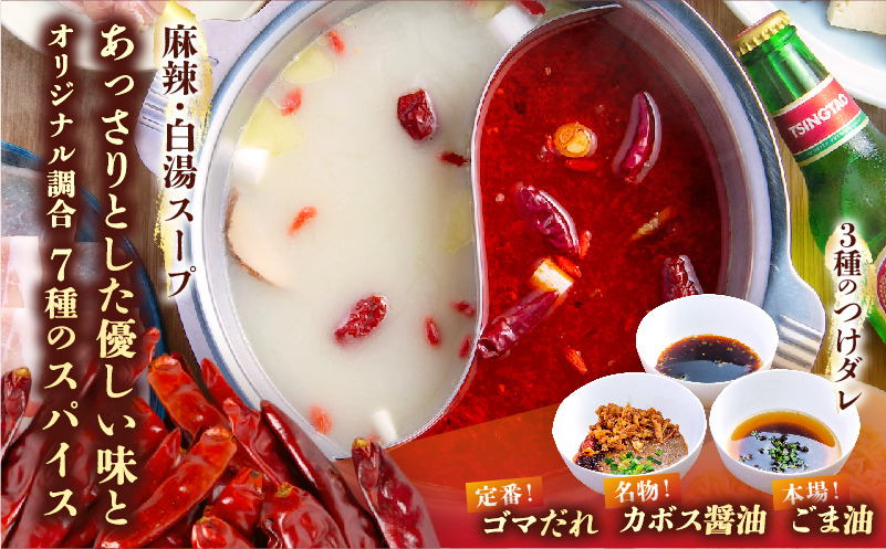 大分の新鮮食材と本場中国の食材をうまく掛け合わせた火鍋の具材、オリジナルのスープとタレを開発。