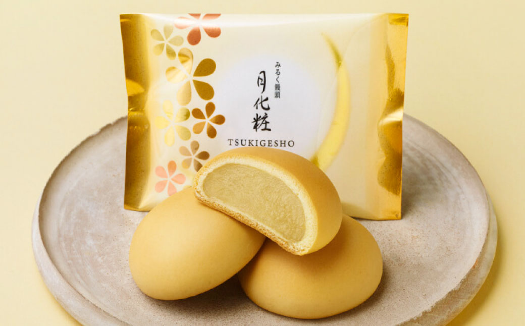 大阪土産としてもおなじみの月化粧は、自家製餡した白餡の中にミルクの風味豊かな練乳とバターをたっぷり入れたみるく餡を包んで焼き上げたやさしい味わいのみるく饅頭。